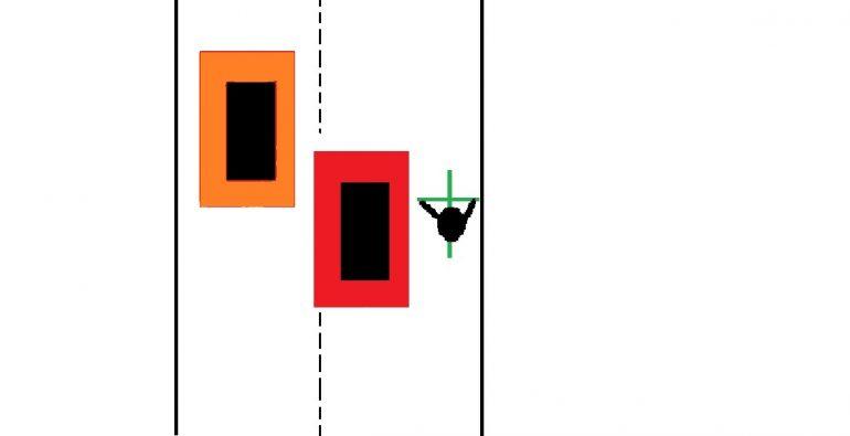 Jeszcze większe dziadostwo, to wpychanie się pomiędzy rowerzystów. Tak jak na rysunku powyżej – mamy dwóch rowerzystów jadących z przeciwnych kierunków, a do tego pojawia się samochód. I pech chce, że wszyscy spotykają się w jednym miejscu. Wielu kierowców (nie mówię, że wszyscy), zamiast zdjąć nogę z gazu, włącza tryb “dawaj, dawaj, zmieścisz się“. No i zazwyczaj się mieści, jednocześnie nie zachowując metra od rowerzysty (albo i obu), ponosząc mu ciśnienie.