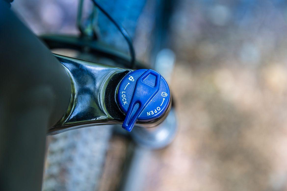 Eleglide we wszystkich wersjach modelu M1 zastosował nowy amortyzator. W poprzedniej wersji (nie ma jej już w sprzedaży) widelec był bardzo “drewniany” i słabo amortyzował nawet mniejsze nierówności. W obecnie sprzedawanym modelu dostał on możliwość zablokowania (dźwignią na prawej goleni), a także pracuje zauważalnie lepiej. Nadal jest to bardzo podstawowy amortyzator, ale czuć, że radzi sobie lepiej na gruntowych drogach. Na pewno na ten fakt wpływ mają też duże, 29. calowe koła, które tłumią trochę lepiej niż mniejsi bracia. Nie oczekujcie jednak, że zapewni komfort i przewidywalność podczas szybkiego zjazdu po kocich łbach czy drodze naszpikowanej dziurami.
