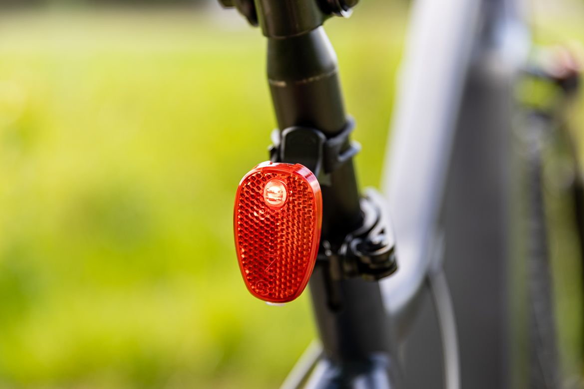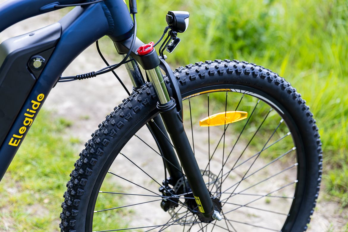 Producent dołącza do roweru komplet oświetlenia. Przednie jest zasilane z akumulatora roweru, natomiast tylna lampka ze zwykłej baterii. Szkoda, że Eleglide nie pokusił się o wyprowadzenie przewodu zasilającego tylną lampkę, moglibyśmy wtedy całkowicie zapomnieć o wymianie baterii w oświetleniu.