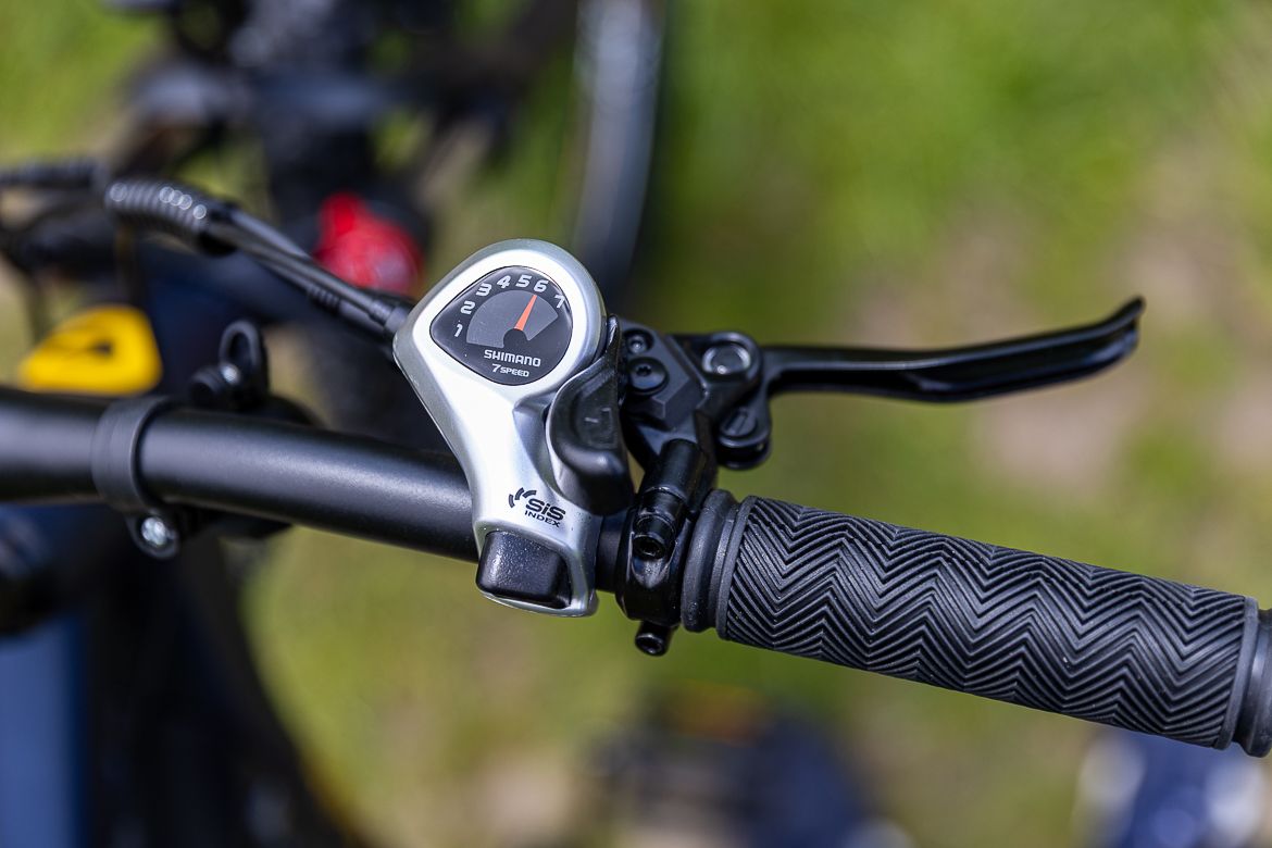 Za zmianę przełożeń na 7-rzędowymi wolnobiegu odpowiada przerzutka Shimano Tourney. Obsługujemy ją za pomocą manetki pochodzącej również od Shimano, choć jest to nietypowy model, który upodobali sobie chińscy producenci. I jeżeli przyzwyczailiście się do cynglowych manetek, będzie potrzebna chwila, aby przestawić się na coś trochę innego. Choć trzeba przyznać, że zmiana przełożeń taką manetką jest wygodniejsza, niż się wydaje na pierwszy rzut oka.