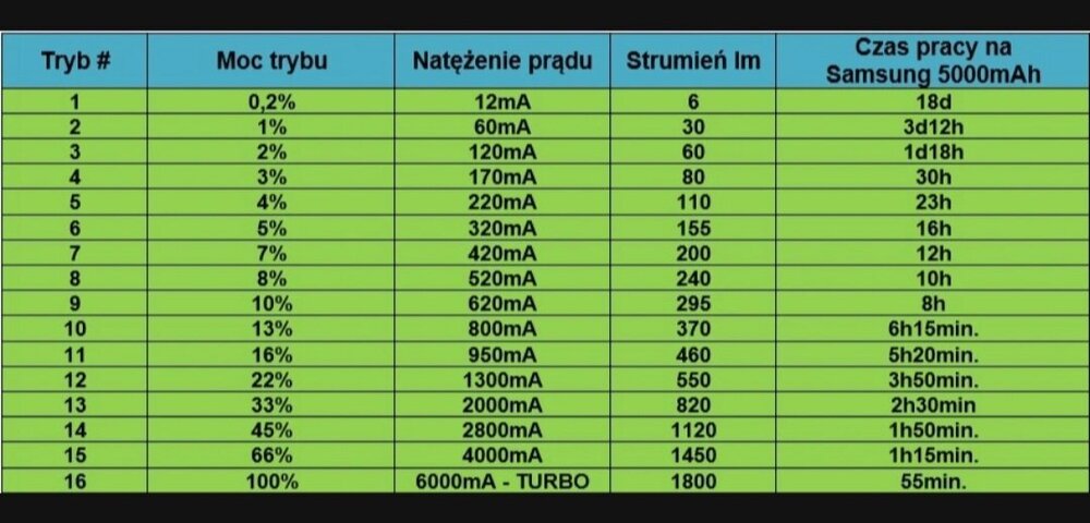 Producent podaje czas pracy tej latarki (foto). Aż niewiarygodne... Sprawdzę niebawem. Bocialarka Convoy S21A 1800lm SST-40 5000K.