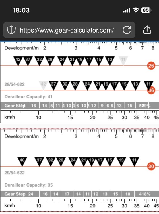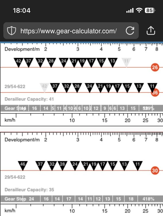 W XC100 i EXPL540 możesz założyć przednią przerzutkę z linią łańcucha boost (ciąg linki sideswing) i poprowadzić pancerz po wierzchu. Ale polecam Ci pojeździć na 1x11 może się okazać, że będzie dobrze. W expl540 mam 30x11/46 (tarcza 32z też jest w razie czego). Naprawdę jest wystarczająco do amatorskiej jazdy. 30x11 to jeden bieg wolniej niż 36x11. Porównanie dla kadencji 60 i 90: -