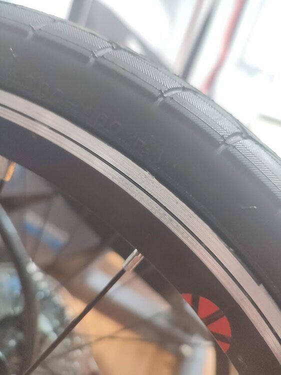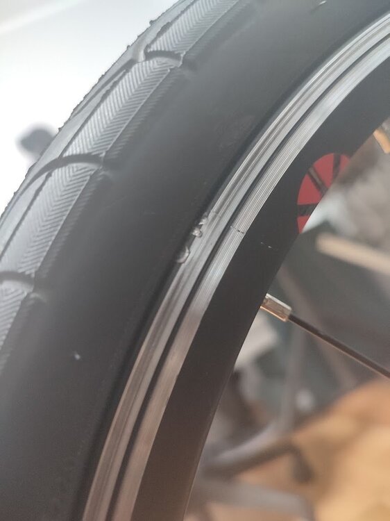 Załączam zdjęcia, te same zdjęcie wysłałem firmie sprzedającej. Firma koło przyjeła na wymiane/naprawe ale niestety koło zostało zwrócone mi te same, zaszlifowano tylko zacior i problem z obcierającym hamulcem został. Serwis po oględzinach/pomiarach stwierdził że koło bije w tym miejscu ponieważ najechano na krawężnik - oczywiście takie coś nie miało miejsca. Tak jak pisałem, ten dźwiek słyszałem odrazu po rozpoczęciu jazdy. Przekazałem swoje przemyślenia jeszcze raz do firmy sprzedającej, w skrócie: wady symetryczne po dwóch stronach i bicie obręczy w tym miejscu wskazuje że to są powiązane rzeczy i to, że opona w tym miejscu jak czysta jak nówka, jak i na samej obręczy nie ma zabrudzeń dodatkowych zarysowań w tym miejscu. Zdjęcia podsyłam, poproszę o waszą ocenę, bo czuję, że sprawa może się przeciągać. Na rower czekałem bardzo długo, miał to być jeszcze inny model Dahona i niestety za poleceń sklepu wybrałem ten z racji, że nie chciałem czekać kolejnego miesiąca, a teraz czekam z uziemionym rowerem z uszkodzonym kołem.