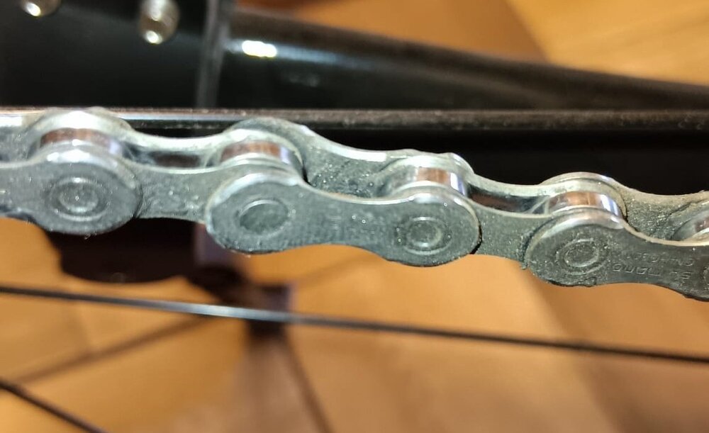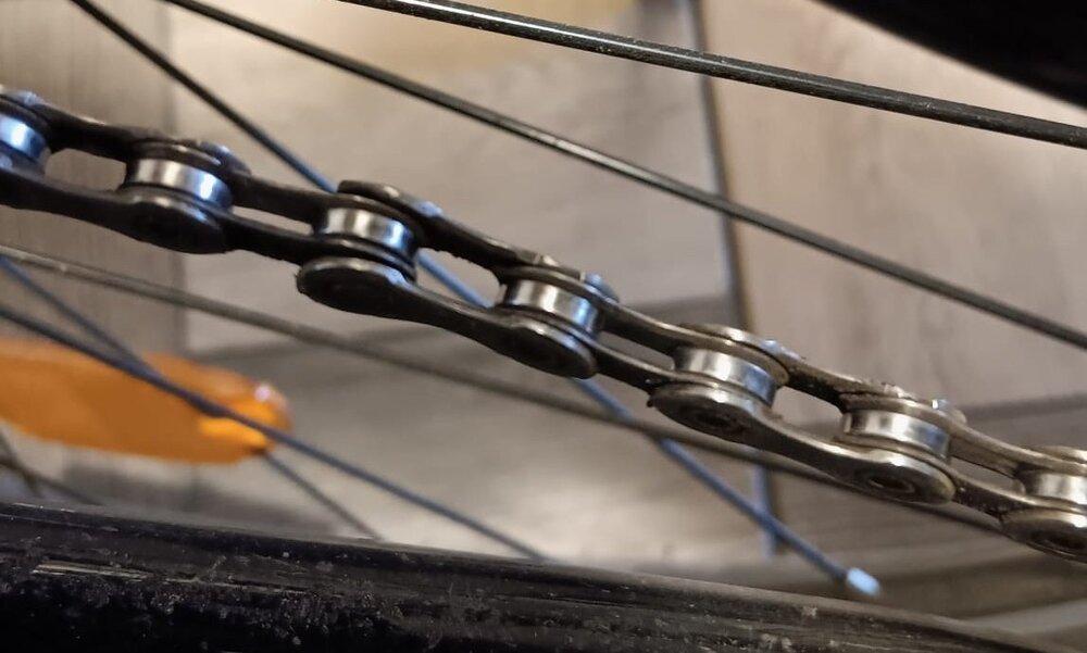 Niestety teraz minęły już dwa tygodnie, a łańcuch wygląda trochę gorzej (zdjęcie) i zaczął przeskakiwać na wolnobiegu (jakby chciał spaść na niższą tarczę.