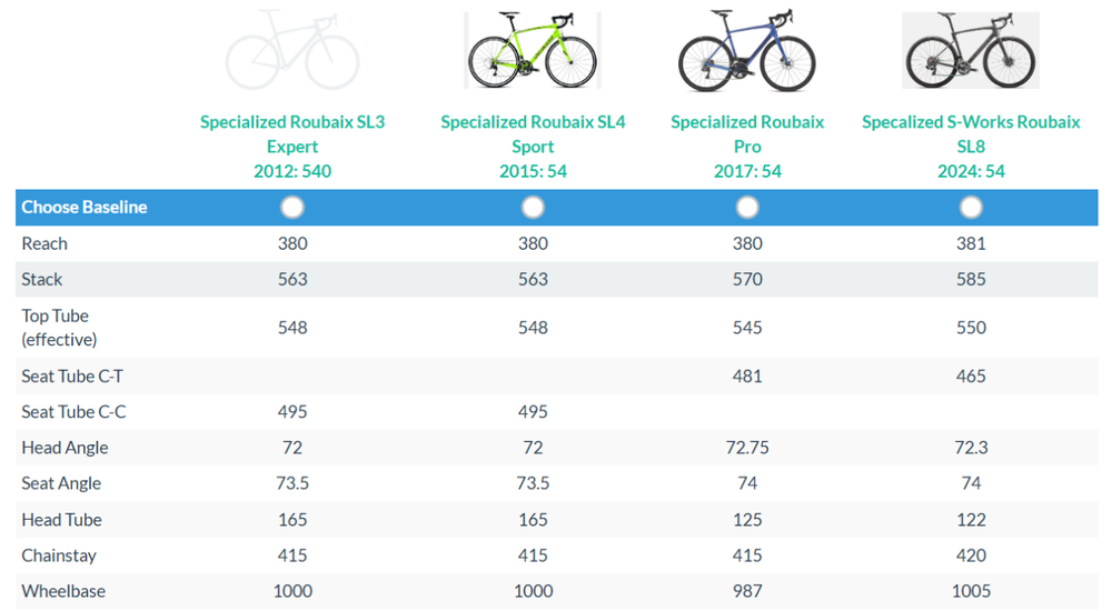 Sprawy wyglądają tak: Zacznijmy od geo. Roubaix przez lata miało reach ok. 380, stack 563 Jak widać zaczęło się to zmieniać w pierwszych modelach na tarczach. W 2017 zmieniono stack na 570 i skrócono widełki do takiej długości jak mają szosy race. Obecna geo ma dłuższy wheelbase bo rower z roweru endurance przekształcił się w all road. I musi brać szerszą oponę. Stack też został zwiększony. Przez to zmieniły się kąty. A teraz wracając do pozycji. To jak szybko jedziesz zależy od kilku czynników. Im jedziesz szybciej tym bardziej wzrastają opory czołowe. Od czego zależą? Od tego jaki jest obrys sylwetki. Im jesteś szerszy, tym opór większy. Więc pierwsza rzecz jaką należy zrobić to redukcja szerokości. Dlatego wszyscy wyczynowi zawodnicy (oprócz sprinterów) jeżdżą na wąskich kierownicach. Mój syn jeździ na 35 na górze. Ja się zastanawiam nad 38 a jeżdżę na 42. Kierownica typu aero jest szybsza niż okrągłorurkowa. Więc wszyscy mają aero. A co do wysokości. Trend się zmienił. Wielu zawodników nie ma już mostka równi z ramą. Czyli tzw. slammed stem. Czemu? Bo okazało się że w chwycie aero czyli z rękami na klamkach, równoległymi do podłoża, bardzo niska pozycja nie jest szybsza a jest niekomfortowa. My amatorzy do pewnych pozycji nie zejdziemy. Po prostu nie mamy takiej mobilności kręgosłupa piersiowego. A druga sprawa to im będziemy schodzić niżej tym bardziej będą pojawiać się inne problemy. Np. kurcze prostownika biodra. Ja mam tak na przykład. Zmienia się kąt biodrowy i nie pojadę długo taki przykurczony. Raz że będzie mnie bolał kark i kręgosłup piersiowy. A dla że dostanę kurczów prostownika biodra. Żeby temu zaradzić trzeba by ćwiczyć jogę i skrócić korby żeby skompensować pozycję. -