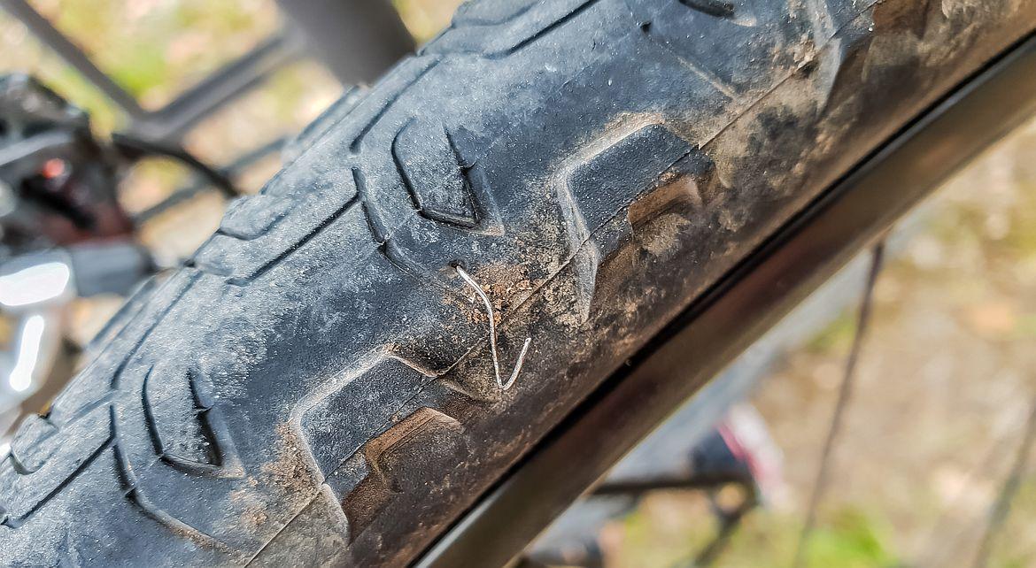 Dzień zaczął się dla mnie pechowo jeszcze z innego powodu. Stanąłem na chwilę na zapiaszczonym poboczu, aby sprawdzić czy dobrze jadę. Niestety musiał leżeć tam drucik, który widzicie na zdjęciu. Sporo już na tych oponach przejeździłem (Giant P-SLX2 z modelu AnyRoad, o którym pisałem już na blogu) i akurat na tym wyjeździe pierwszy raz złapałem kapcia. Cóż, pół godziny poszło w plecy (łącznie z powrotem na stację benzynową, na mycie rąk). Na szczęście później nie miałem już takich przygód.