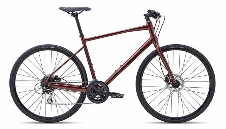 Marin Fairfax 2 – to rower fitnessowy w najbardziej klasycznym wydaniu. Aluminiowa rama ze sztywnym widelcem, napęd 2×8 Shimano Toruney/Altus (uwaga, trochę brakuje bardzo lekkich przełożeń), hydrauliczne hamulce tarczowe Clark’s. Do tego opony Vee Tire o szerokości 35 mm, a także fabryczne otwory do montażu błotników i bagażnika.