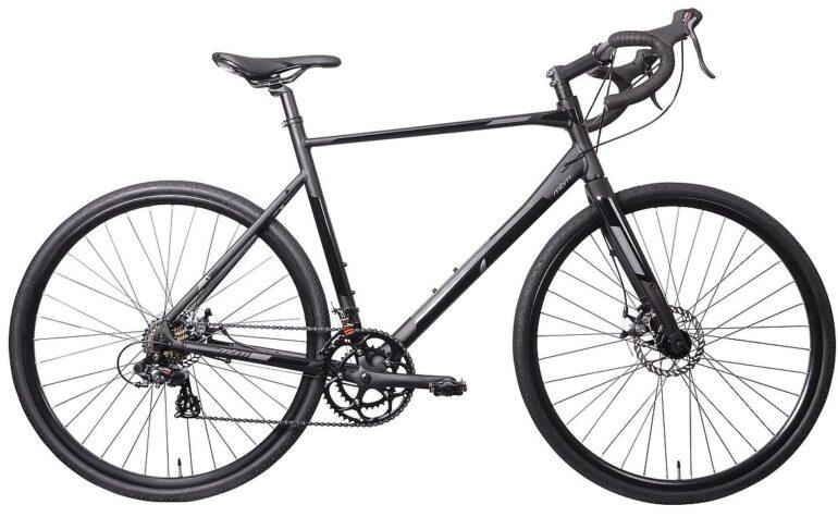 Triban RC500 – choć ten Triban jest opisywany jako rower szosowy, możemy spokojnie podciągnąć go do kategorii gravel. Choćby dlatego, że wchodzą do niego opony do 36 mm. Aluminiowa rama i karbonowy widelec dają możliwość założenia bagażników oraz błotników. Napęd to “tradycyjny” dla szosówek dla amatorów zestaw 50-34 z przodu i 11-32 z tyłu (polecam lekturę wpisu: Gdzie się podziały lekkie przełożenia w rowerach gravelowych), działający na prawie pełnym, 9. rzędowym zestawie Shimano Sora (korba jest na zintegrowanej osi, co się bardzo chwali). Za hamowanie odpowiadają mechaniczne hamulce tarczowe Promax DSK-300R.