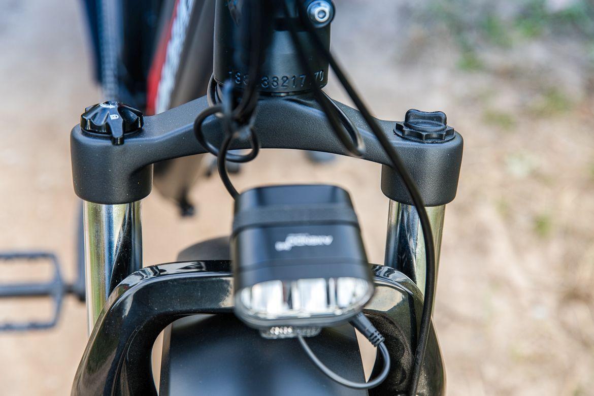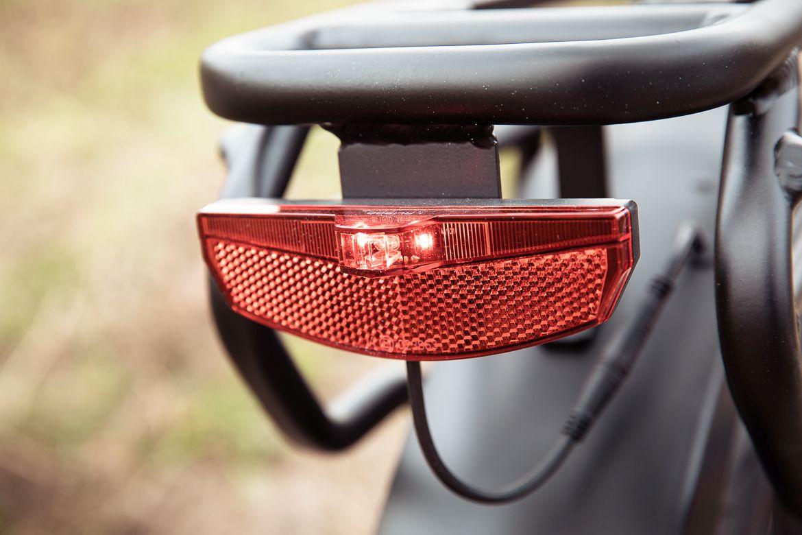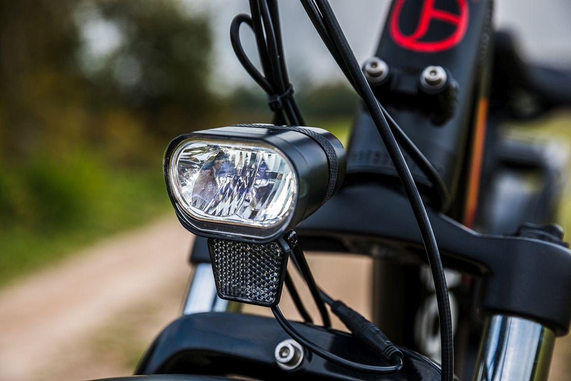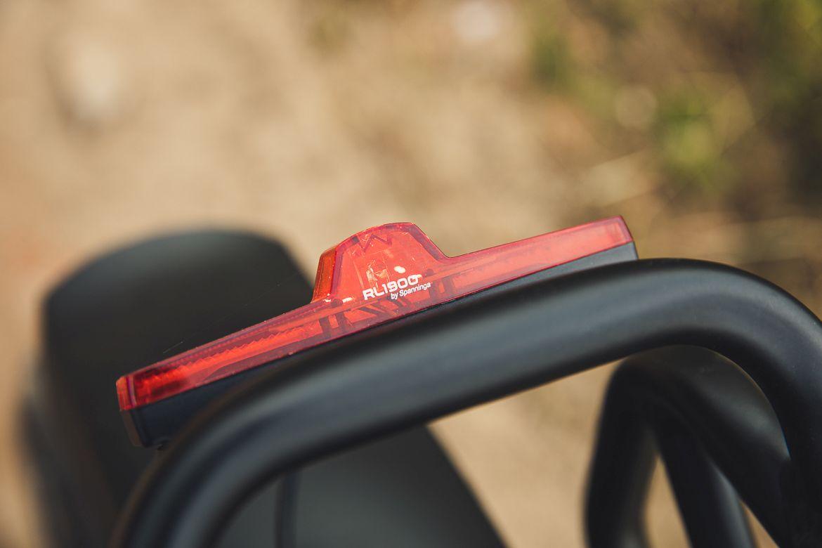W przypadku rowerów elektrycznych, które na swoim pokładzie posiadają duży akumulator, aż prosi się o zamontowanie oświetlenia, które będzie korzystać z takiej wbudowanej baterii. Nie inaczej jest w przypadku Robina, gdzie oświetlenie marki Spanninga robi dobrą robotę. Tylna lampka jest widoczna z daleka, a przednia świeci wystarczającym światłem, by po zmroku wrócić do domu. Nie jest to może reflektor, który pozwoli na szybką jazdę po lesie, ale do spokojniejszego poruszania się wystarczy. A gdyby komuś był potrzebny mocny reflektor, będzie można go zasilić z jednego z gniazdek USB :)