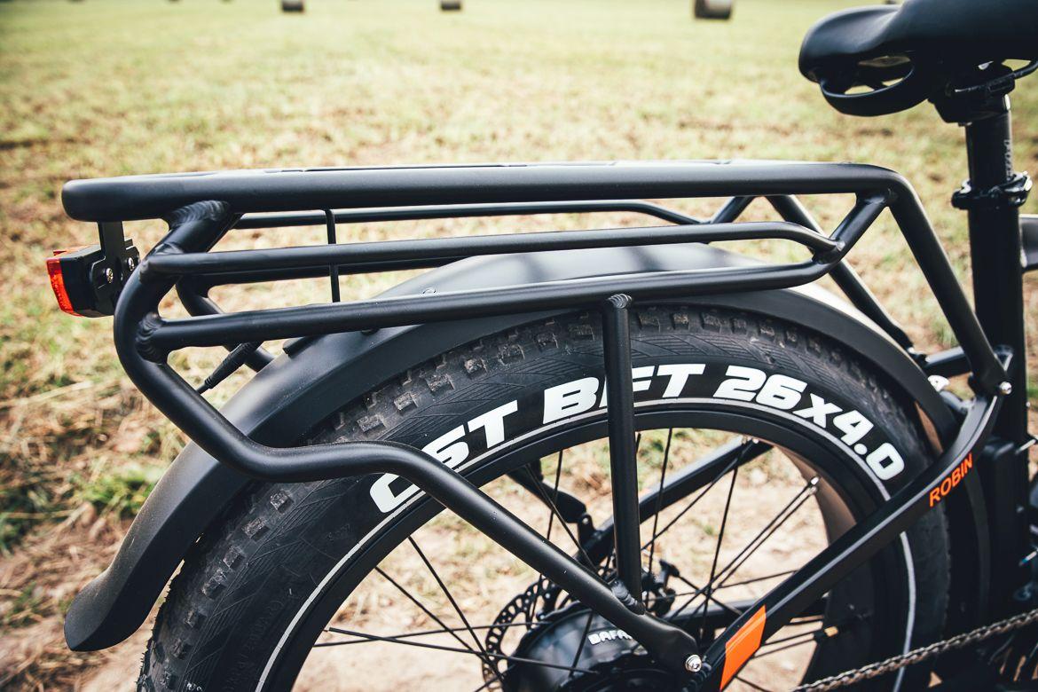 Nie da się ukryć, że Robin to kawał roweru. Rozstaw kół jest spory, a szerokie i wysokie opony potęgują to wrażenie. Waga również nie jest piórkowa – mi wyszły 33 kilogramy z zamontowanym akumulatorem, bagażnikiem, błotnikami i pedałami. Spory wpływ na taki wynik mają oczywiście potężne koła, ale także bagażnik czy pojemny akumulator.