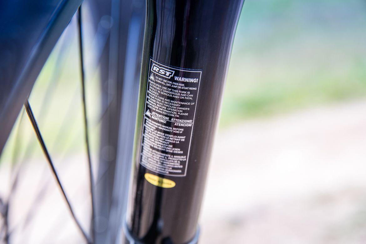 Z przodu pracuje markowy, sprężynowy amortyzator RST o skoku 80 milimetrów. Szczerze mówiąc, szerokie opony po ustawieniu odpowiedniego ciśnienia, robią tak dobrą robotę w kwestii tłumienia nierówności, że amortyzator nie ma tu za dużo pracy. Ale podczas jazdy po bardziej wymagającej nawierzchni (kamienie, korzenie) spełnia swoje zadanie, wspomagając opony w tej kwestii. Na prawej goleni znajduje się manetka służąca do blokowania amortyzatora, a na lewej pokrętło do regulacji naprężenia wstępnego sprężyny, choć jej zakres jest niewielki i nie wpływa znacząco na pracę widelca.