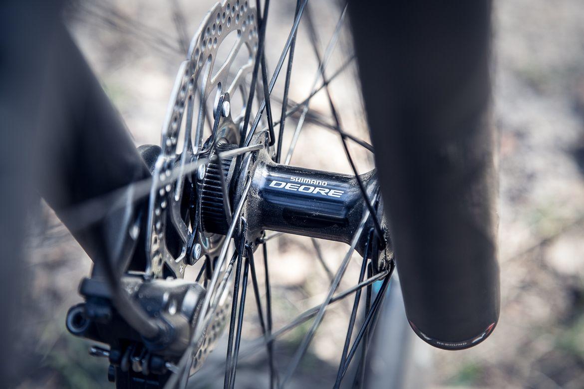 Hamulce to hydrauliczne tarczówki Shimano BR-MT400, czyli coś klasy Alivio. Do tego tarcze o średnicy 160 mm, montowane na wielowypust Centerlock. Nie ma co ukrywać, nie są to topowe hamulce i z pewnością nie będą wystarczające do ostrej jazdy w cięższym terenie. Nie jest to wielki zarzut w stosunku do tego roweru, większość producentów do rowerów z tej (lub nawet wyższej) półki cenowej montuje tego typu hamulce. Aby zwiększyć ich siłę hamowania, można pokusić się o wymianę klocków na metaliczne oraz założyć lepsze tarcze.