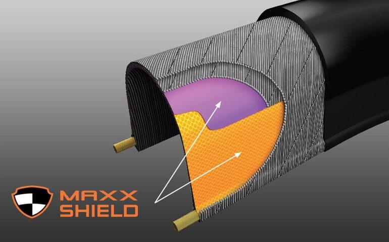 Maxx Shield to ta sama technologia co we wkładce Silk Shield, ale dodatkowo wzmocniona materiałem K2 pod bieżnikiem. Jest stosowana w wybranych oponach szosowych, gravelowych oraz turystycznych. W niektórych oponach stosowany jest sam materiał K2.