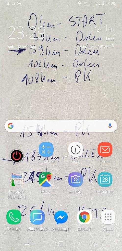 W każdym razie uznałem, że będę improwizował i może po drodze do kogoś dołączę. Tymczasem na trasie zaliczyłem prawie każdą większą stację benzynową :) Jeszcze w domu przygotowałem sobie rozpiskę, gdzie oprócz oficjalnych punktów kontrolnych będę mógł zatankować. Temperatura szybko wzrosła do 25 stopni, więc piłem naprawdę dużo, a takie szybkie pit-stopy były na wagę złota. Spontanicznym pomysłem było zrobienie zdjęcia tej rozpiski i wrzucenie na tapetę do telefonu. Dzięki temu miałem cały czas pod ręką informację, gdzie co jest i mogłem rozplanować ewentualne postoje.