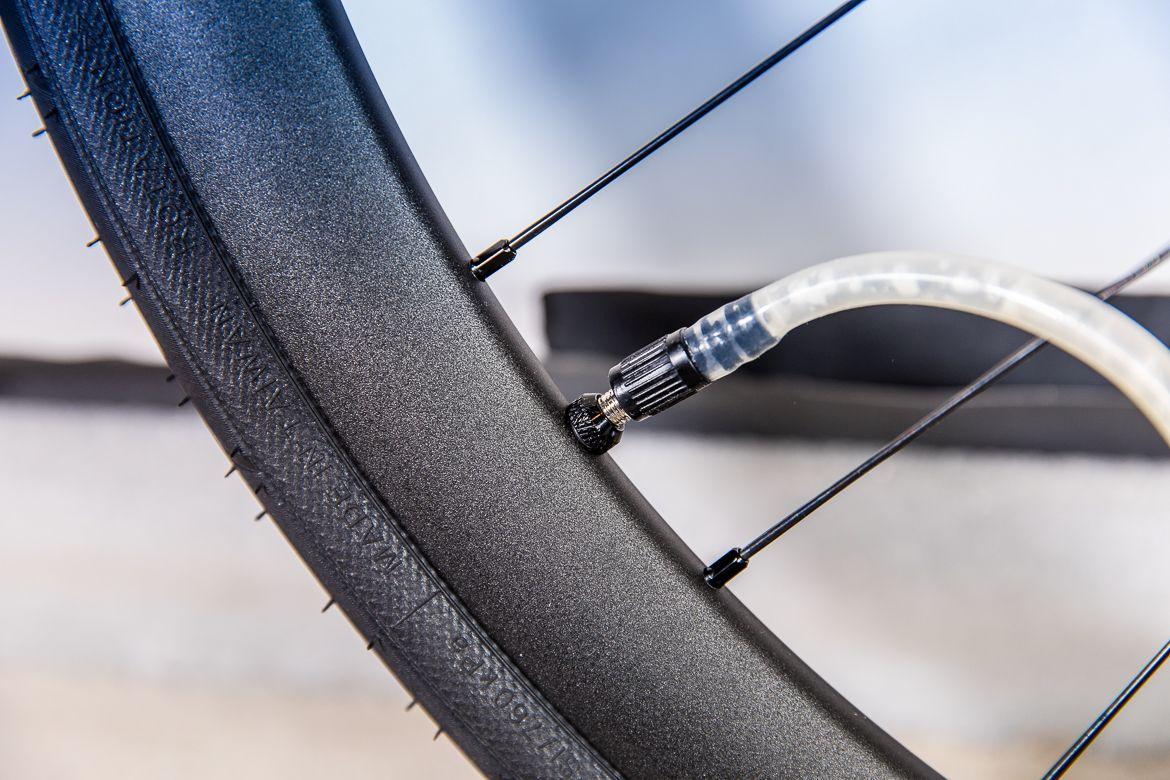 Po wlaniu mleka wkręcamy wentyl (lub zakładamy oponę) i pompujemy. Aha, zawsze podczas pompowania ustawiaj wentyl na godzinie 11. lub 1. Dzięki temu mleczko, które jeszcze nie spłynęło, nie będzie wlewać się do wentyla. Uważaj też, aby nie przekroczyć maksymalnego zalecanego ciśnienia przez producenta obręczy/opony (w zależności, które jest mniejsze). W szczególności dotyczy to obręczy hookless czyli bez haków na rantach.