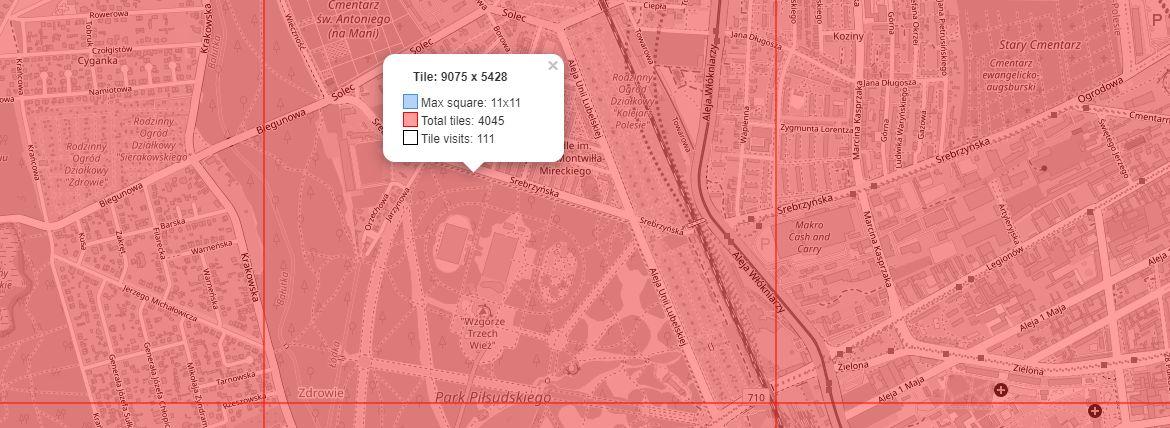 Jeżeli kliknie się na dowolny kwadrat, pokażą się statystyki. Max square – największy duży kwadrat, Total tiles – liczba wszystkich zdobytych kwadratów, Tile visits – ile razy przejeżdżaliśmy przez dany kwadrat.