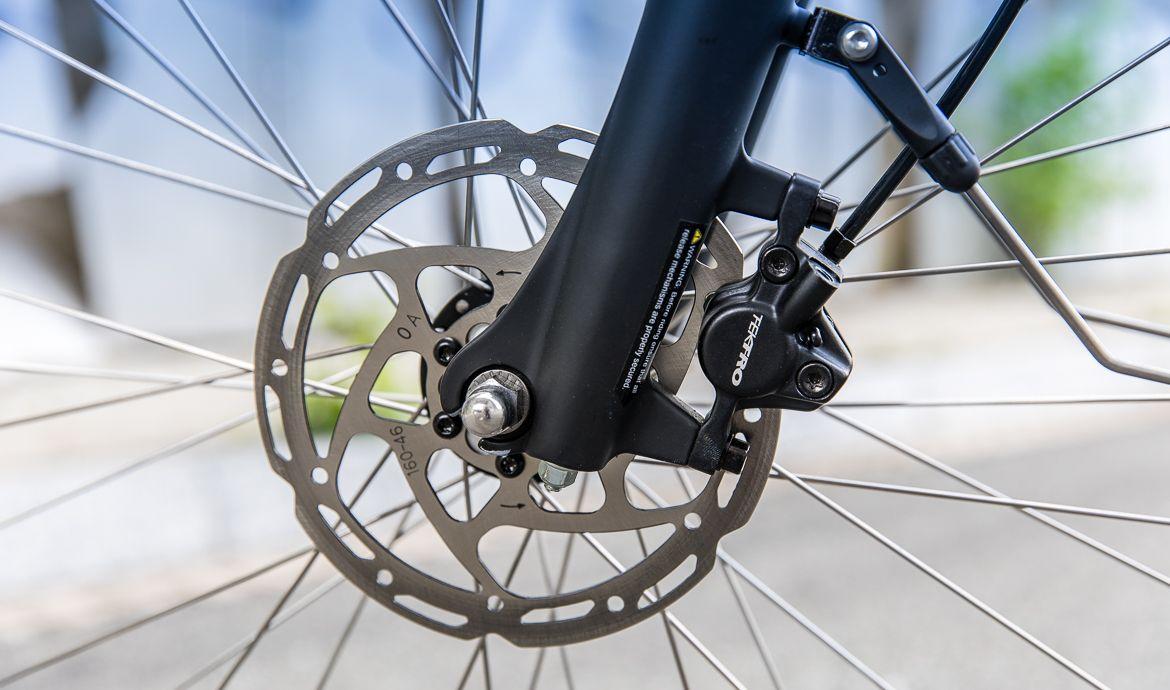 O hydraulicznych hamulcach tarczowych Tektro mogę napisać jedno – działają dobrze. Doszliśmy do takiego etapu rozwoju tarczówek, że każdy markowy model takich hamulców będzie wystarczający do jazdy turystyczno-rekreacyjnej. Tak też jest w tym przypadku, tarcze nie mają najmniejszego problemu z zatrzymywaniem stosunkowo ciężkiego elektryka.