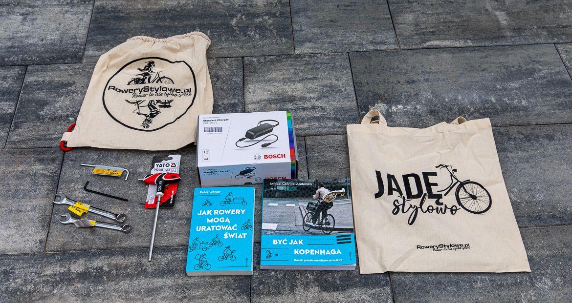 W pudełku razem z rowerem znajdziecie także miłe akcenty w postaci materiałowej torby i worka, a do tego jedną z książek o wpływie rowerów na zmieniający się świat (ja dostałem dwie, ale o tym ciii ;) Jest tam też wspomniany wcześniej zestaw kluczy, ładowarka do akumulatora oraz instrukcja z kartą gwarancyjną.