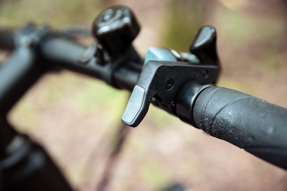 Razem z rowerem otrzymujemy także manetkę gazu, choć w zasadzie kształtem przypomina ona bardziej dźwigienkę. Możemy jej użyć np. jako pomoc podczas ruszania, co może się przydać zwłaszcza pod górkę, ponieważ silnik zaczyna działać dopiero po wykonaniu 0,5-1 obrotu korbą.